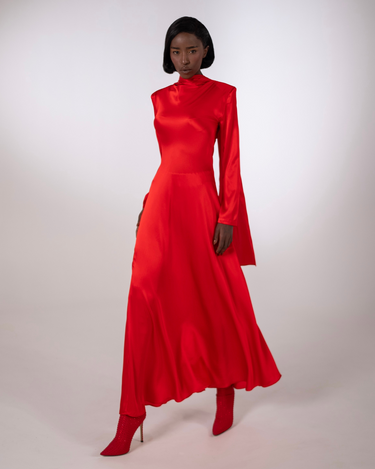 O reinterpretare indrazneata a tinutelor clasice de seara, Rochia Lunga din Matase Rosie imbina fluiditatea cu structura. Cu un decolteu delicat drapat si un fular elegant, lung, din matase, ce se revarsa de pe umar, aceasta piesa emana sofisticare fara efort, imbratisand in acelasi timp feminitatea moderna prin talia sculptata si fusta ampla in linie A.