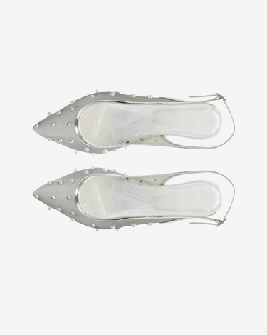 Balerinii Zoe cu varf ascutit, argintiu-oglinda imbina stralucirea subtila cu eleganta unui design aerisit si modern. Realizati din piele naturala si mesh de inalta calitate, sunt accesorizati cu perle aplicate manual ce adauga un detaliu feminin si rafinat. Perfecti pentru tinute urbane, lejere sau chic de vacanta.