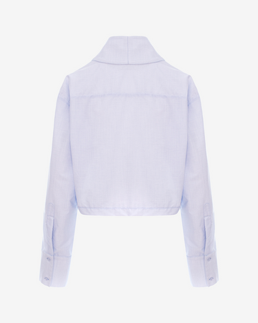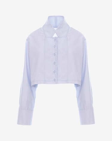 O camasa supradimensionata, scurta si cu o croiala boxy, intrerupta de mansete prelungite si un decolteu unghiular pronuntat care taie silueta clasica. Proportiile neasteptate imita erorile de sistem - un omagiu adus distorsiunilor din traducerile digitale. Realizata din poplin rigid subtire, piesa juxtapune structura precisa cu o subtila subversiune, evidentiind tensiunea dintre perfectiunea digitala curatoriata si realitatea umana fragmentata.