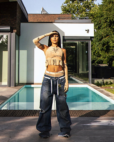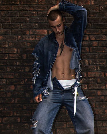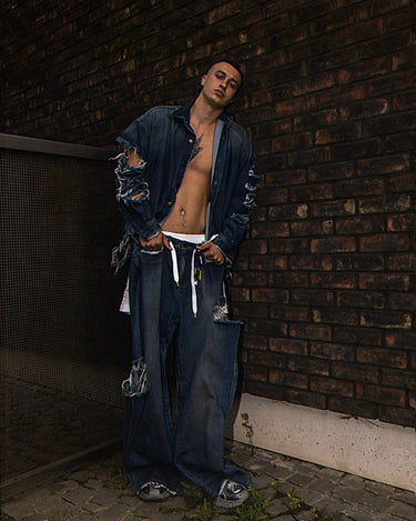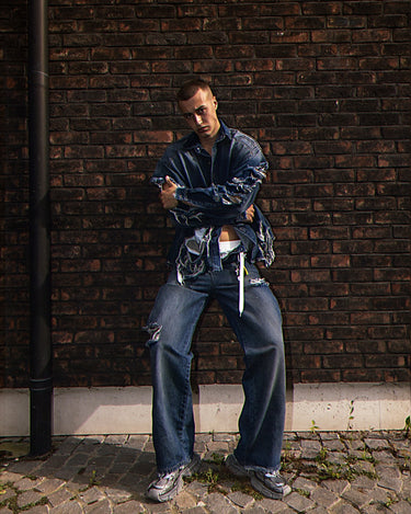 Jeans Denim Garage Look, o piesa vestimentara unisex, aduce un aer nonconformist in garderoba ta. Croiala larga si talia medie asigura confort, in timp ce aspectul denim uzat cu rupturi adauga un plus de atitudine. Detaliile, precum cheile, lacatul, inima franta si siretul de pantofi, confera un aspect unic. Acest model este perfect pentru cei care doresc sa se exprime prin stilul lor.