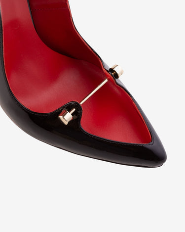 Pantofii din Piele Lacuita C Harlot, negri, sunt o alegere eleganta, confectionati din piele lacuita, cu accesorii metalice si toc metalic. Tocul este personalizabil, disponibil in doua dimensiuni: 10 cm si 12 cm. Acestia sunt fabricati in Romania, combinand designul modern cu calitatea materialelor.