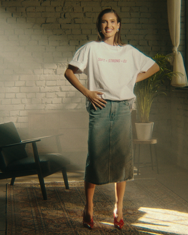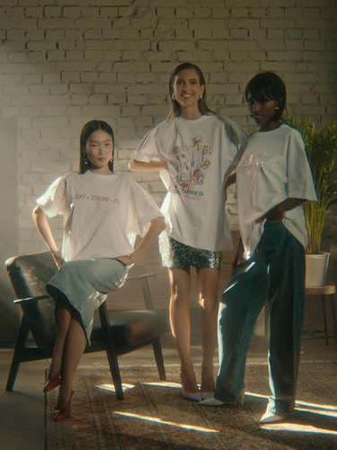 Pe partea din fata, mesajul „Soft + Strong = Eu”, scris cu print digital, transforma un slogan intr-un manifest. Pe spate, este prezenta o papadie, realizata din print digital si cristale. Fiecare piesa face parte dintr-o colaborare puternica intre Avon, Friends for Friends si Retro Future, sustinand lupta impotriva violentei domestice si amplificand vocile care cer o schimbare reala.