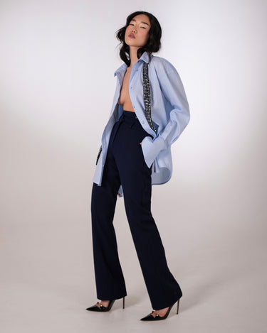 Camasa oversized in culoarea albastru deschis aduce un aer modern si sofisticat garderobei tale. Cu o croiala relaxata si oversized, se aseaza elegant pe corp, oferind confort si rafinament. Manșetele exagerate si gulerul ascutit cu un detaliu metalic discret completeaza designul minimalist, facand-o potrivita pentru orice moment al zilei.