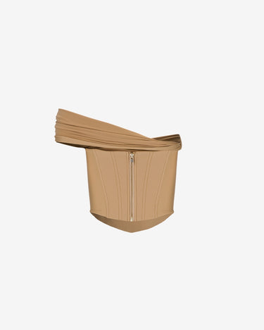 Corsetul cu drapaj asimetric, nude, aduce un plus de eleganta si modernitate oricarei tinute. Croiul lejer din lycra fina ofera confort, iar drapajul asimetric pe un umar adauga un aer sofisticat. Elasticitatea laterala si inchiderea cu fermoar la spate asigura o potrivire perfecta. Ideal pentru evenimente speciale, acest corset te va face sa te simti speciala.