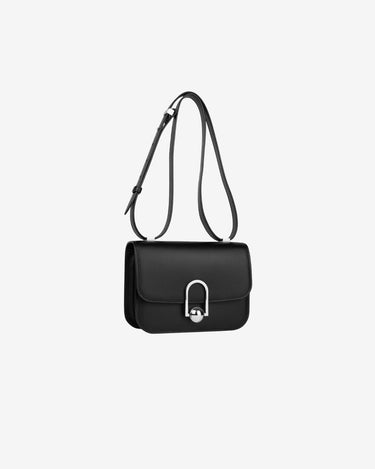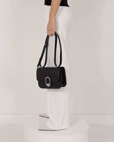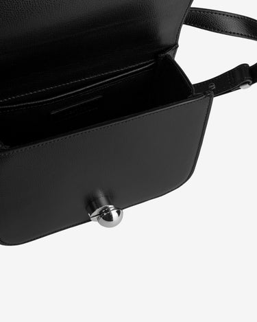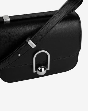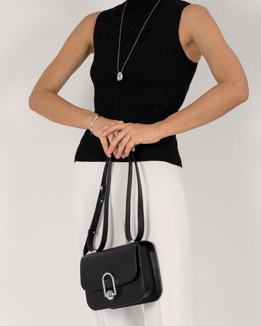 Geanta mini EON, neagra, pastreaza toate elementele definitorii ale versiunii mai mari, intr-o dimensiune compacta, perfecta pentru serile in oras sau zilele in care vrei sa adaugi un aer modern tinutei tale. Designul sau structurat si elegant este accentuat de inchizatoarea cu silueta arhitecturala, iar interiorul incapator iti permite sa porti accesoriile esentiale zilnice.