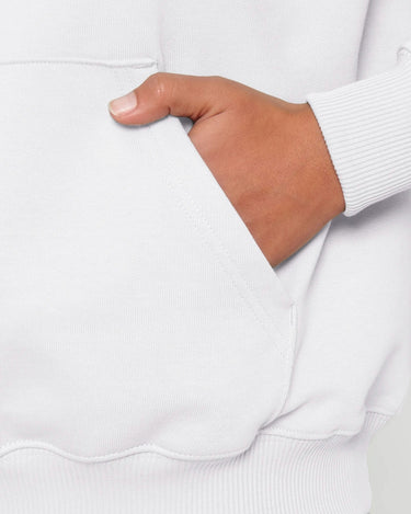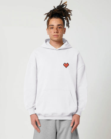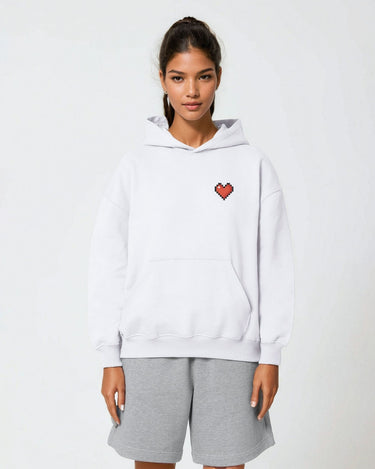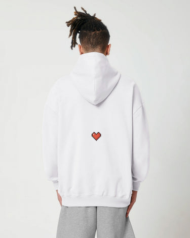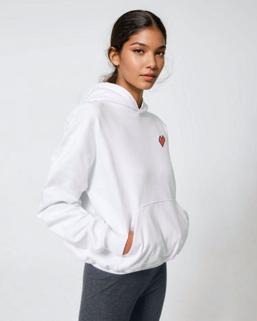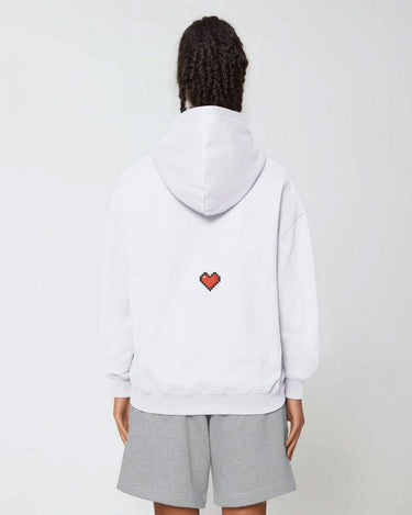 Hanoracul din bumbac Love, alb, este o piesa vestimentara esentiala pentru confortul zilnic. Designul supradimensionat ofera o senzatie placuta si lejera, ideala pentru purtare indelungata. Logo-ul inimii, prezent atat in fata, cat si pe spate, adauga un element distinctiv. Buzunarul tip marsupiu sporeste functionalitatea, facand din acest hanorac o alegere practica si stilata.