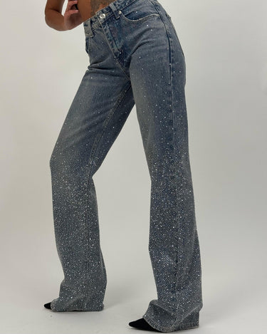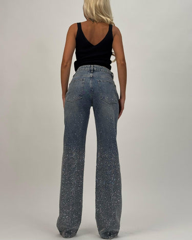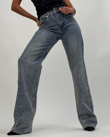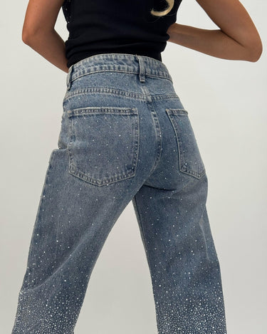 Jeans-ii drepti cu strasuri, denim, sunt perfecti pentru a adauga un plus de sofisticare oricarei tinute, mentinand in acelasi timp un aer relaxat. Croiala clasica dreapta asigura o silueta echilibrata si confortabila, iar detaliile cu strasuri adauga un element de rafinament si stil. Acesti jeansi sunt versatili si pot fi integrati cu usurinta in diverse tipuri de outfit-uri, de la casual la elegant.
