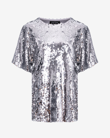 Tricoul din paiete argintii emana energie indrazneata si glamour fara efort. Cu o croiala oversize si umeri structurati, piesa aduce un vibe modern de petrecere, cu influente retro de power dressing. Complet acoperit cu paiete care capteaza lumina, poate fi purtat ca rochie sau ca tricou statement – ideal pentru a straluci si a atrage toate privirile.