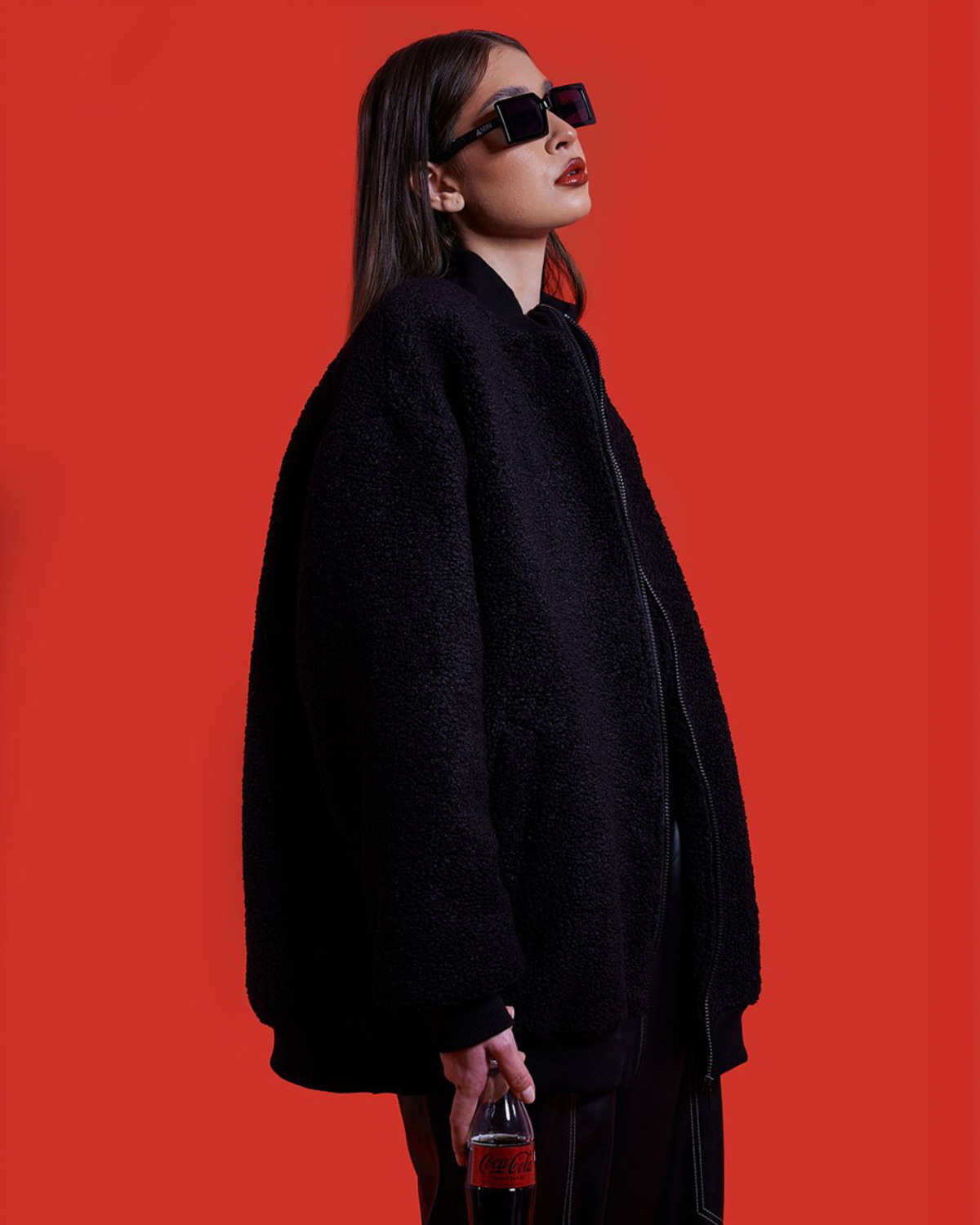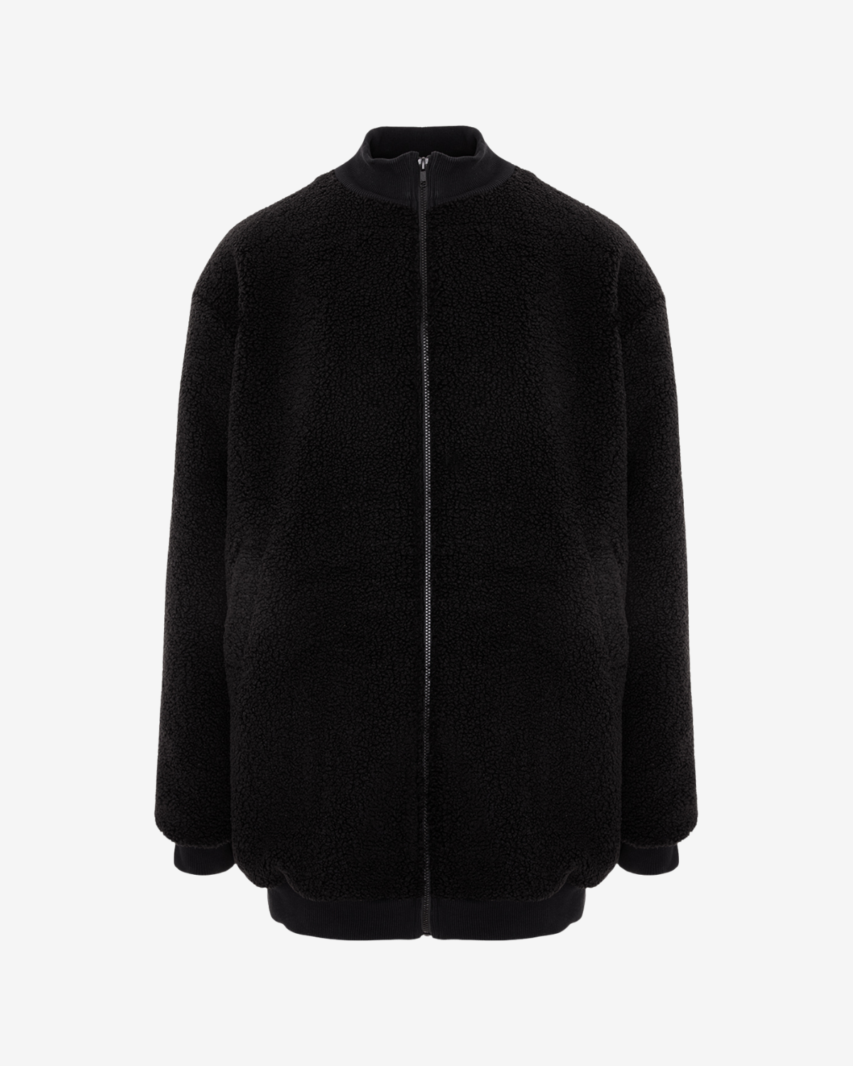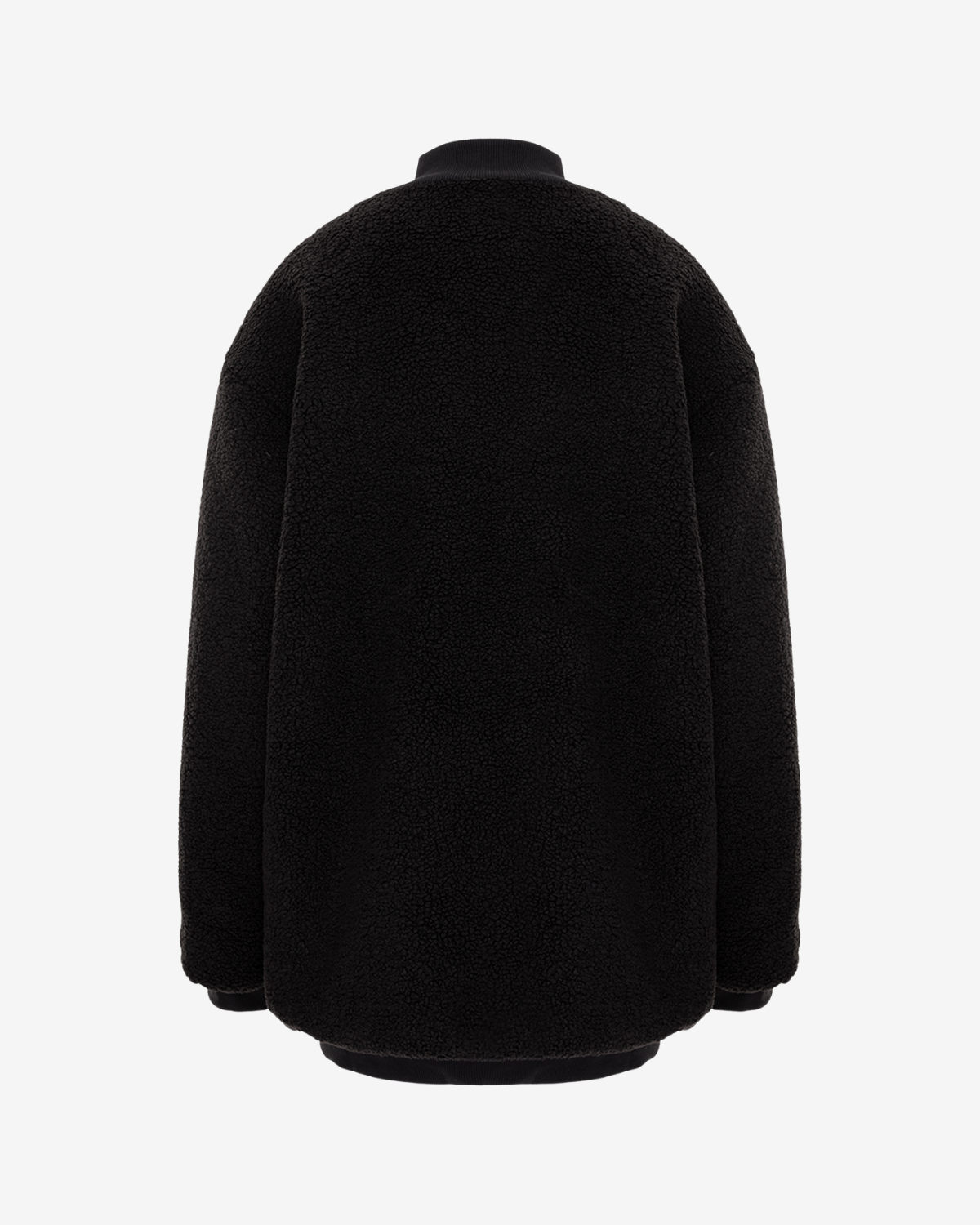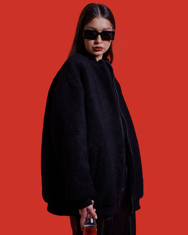 Bomber oversized negru unisex cu textura teddy este o piesa statement cu aer relaxat, inspirata din estetica college reinterpretata intr-o cheie moderna. Bomberul are croiala ampla, inchidere cu fermoar zip-up pe toata lungimea si buzunare discrete, integrate subtil in design. Textura teddy ii ofera un aspect cozy si contemporan, perfect pentru layering in sezonul rece.
