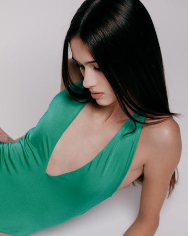 Costumul de baie eris, verde, este o piesa iconica si clasica, conceputa pentru a accentua elegant silueta. Designul sau indraznet include un decolteu adanc si un stil decupat inalt, oferind un aspect sexy si modern. Fermoarul argintiu de la spate adauga un detaliu sofisticat. Versatilitatea acestui costum de baie permite purtarea sa atat in apa, cat si in combinatie cu denimul preferat, pentru un look casual chic.