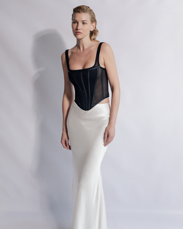 Corsetul Gabriella, negru, este o piesa moderna si structurata, ce imbina tulle-ul elastic cu plasa fina pentru un efect vizual indraznet si sofisticat. Cu un decolteu patrat si baleine pentru sustinere, corsetul ofera o silueta conturata si un look fresh, ideal pentru tinute statement.