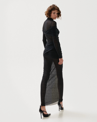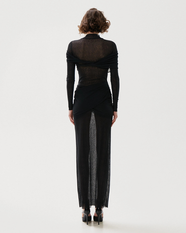 Rochia semi-transparenta cu detalii drapate, blood este o piesa eleganta si seducatoare, cu un design fluid si sofisticat. Drapajele delicate pe bust, umeri si solduri sculpteaza silueta, iar croiala lunga, cu guler inalt si maneci lungi, adauga rafinament si echilibru. Materialul moale si elastic accentueaza natural linia corpului.