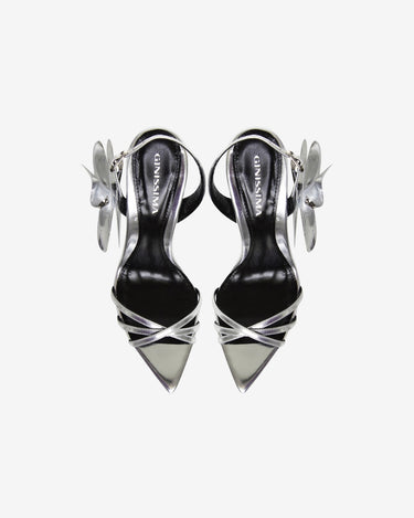 Sandalele din piele naturala Selene, argintii, sunt create pentru a atrage privirile si a adauga rafinament oricarei tinute. Floarea decorativa, lucrata manual cu atentie la detalii, ofera un efect vizual sofisticat. Tocul subtire si calapodul nou pastreaza confortul specific colectiei premium Ginissima, prezentata la Milano si New York Fashion Week.