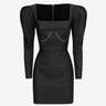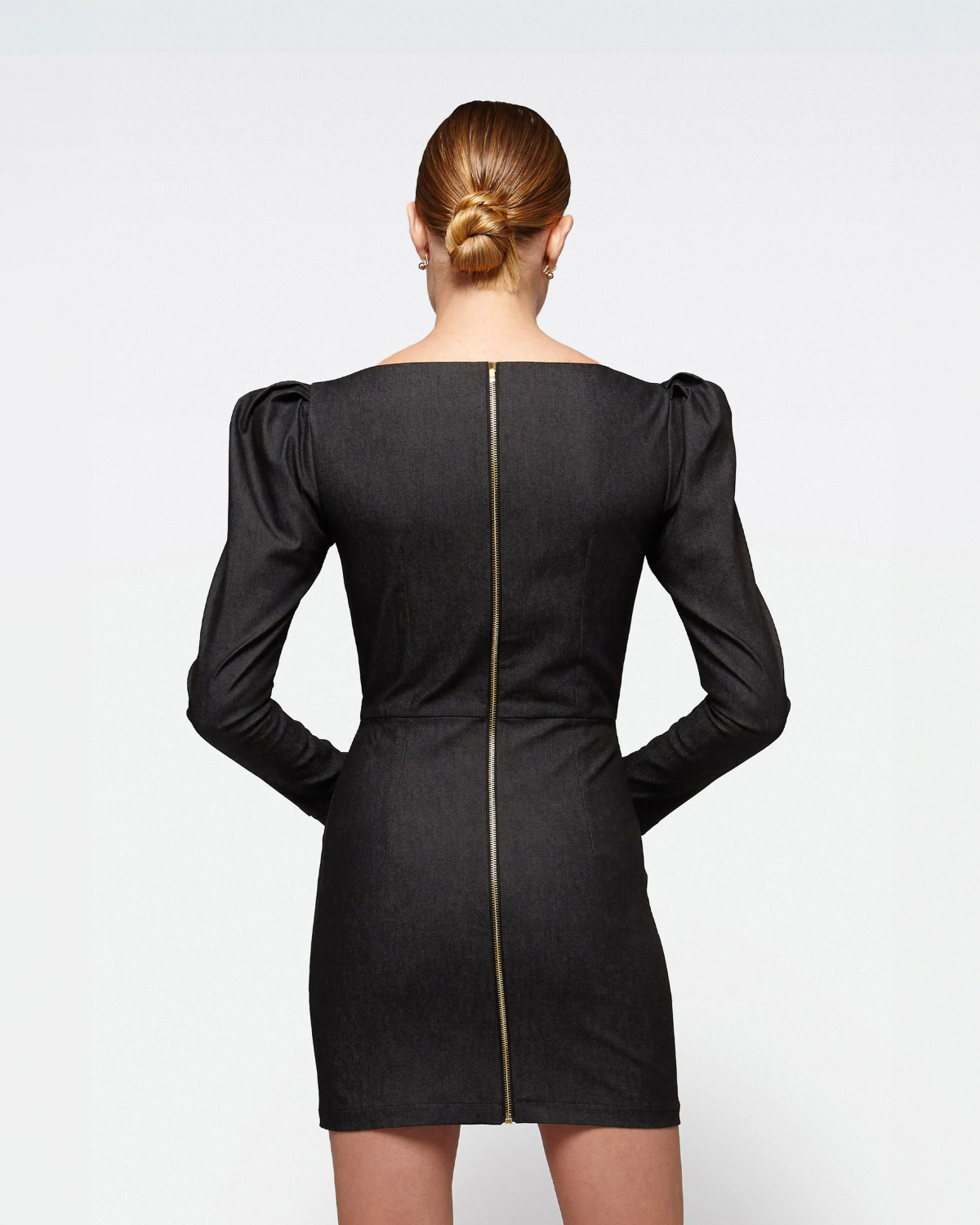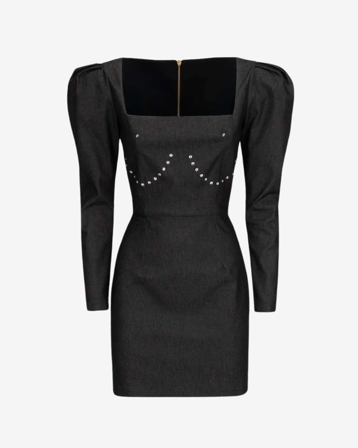 Rochia mini Diamond, neagra, este o piesa statement cu un design modern si stralucitor. Realizata din denim din bumbac, cu maneci lungi si un decolteu generos, rochia impresioneaza prin bustul decorat manual cu cristale stralucitoare, transformand orice aparitie intr-una memorabila si glam.