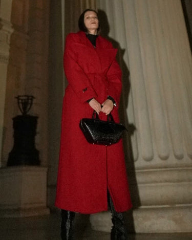 Paltonul lung cu cordon si detalii metalice, rosu, este o piesa vestimentara clasica si atemporala, inspirata de un palton rosu de familie. Acest palton calduros se remarca prin structura masculina, cordonul detasabil in talie si detaliul RF metalic de pe maneca. Buzunarele tip flap si despicatura din spate adauga functionalitate si un plus de stil. Confortabil si usor de purtat, acest palton rosu este ideal pentru zilele reci.
