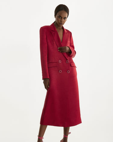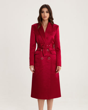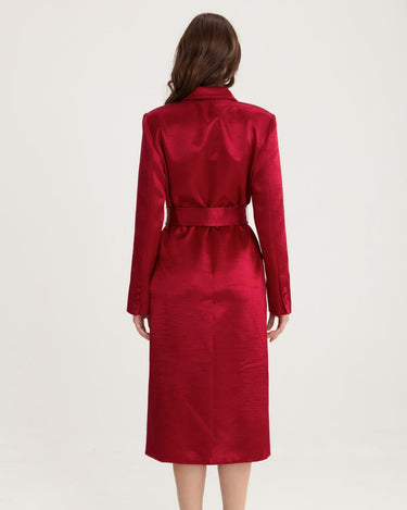 Trench-ul Midi din Satin, Rosu, este o piesa vestimentara versatila, confectionata dintr-un amestec de satin. Designul sau include maneci lungi, inchidere frontala cu nasturi argintii, cordon in talie si doua buzunare cu clapeta, oferind un aspect elegant si functional. Materialul din satin confera o nota sofisticata, facandu-l ideal pentru diverse ocazii.
