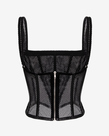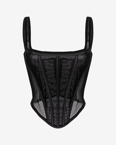 Corsetul Gabriella, negru, este o piesa moderna si structurata, ce imbina tulle-ul elastic cu plasa fina pentru un efect vizual indraznet si sofisticat. Cu un decolteu patrat si baleine pentru sustinere, corsetul ofera o silueta conturata si un look fresh, ideal pentru tinute statement.
