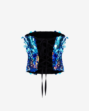 Corsetul sparkle, albastru, este o piesa vestimentara ce atrage toate privirile, fiind perfecta pentru evenimente speciale sau festivaluri. Designul sau stralucitor, datorita paietelor de sclipici, asigura un aspect glamuros si memorabil. Inchiderea cu siret la spate permite o ajustare perfecta, accentuand silueta. Acest corset este ideal pentru a adauga un plus de stralucire oricarei tinute.