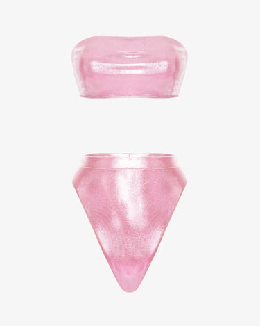 Straluceste effortless cu setul "Metallic Pink"! Acest costum de baie in doua piese, realizat dintr-un material cu efect metalic, iti pune in valoare stralucirea naturala, reflectand lumina intr-un mod care nu poate trece neobservat.