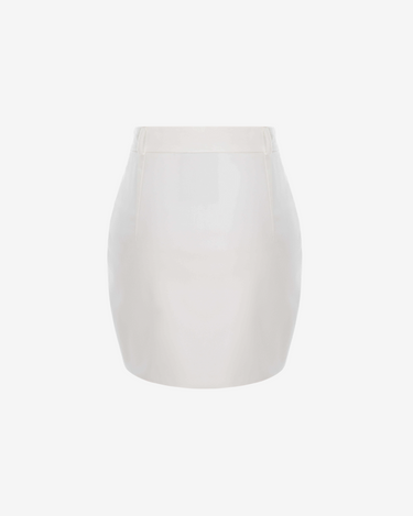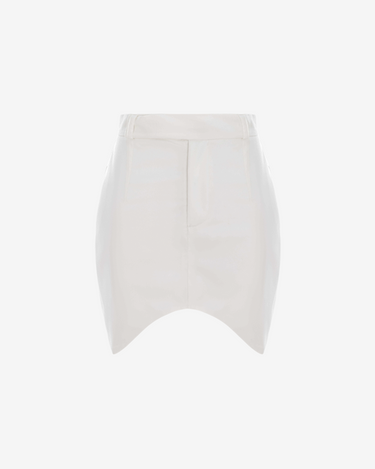 Fusta mini decupata din stofa, alba, este o piesa moderna si eleganta, ce imbina croiala clasica cu un detaliu indraznet in fata. Cu slit frontal, inchidere discreta si bride pentru curea, este dublata cu aceeasi stofa pentru un aspect uniform si un finisaj premium.