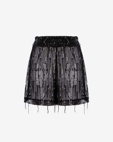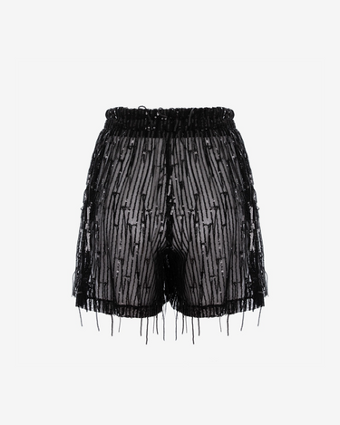 Pantalonii scurti Elixir, negri, sunt o piesa spectaculoasa ce atrage toate privirile prin franjurii cu paiete care stralucesc si se misca fluid la fiecare pas. Cu un croi modern si feminin, adauga energie si rafinament oricarei tinute, fiind alegerea perfecta pentru seri glam si petreceri.