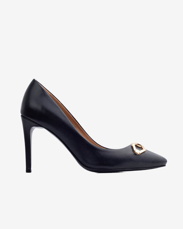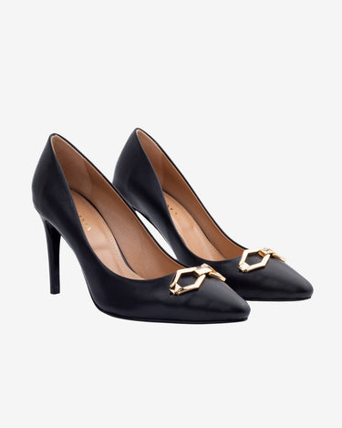 Pantofii stiletto din piele naturala Infinity, negri, imbina eleganta clasica cu un detaliu artistic subtil. Designul lor retro este pus in valoare de accesoriul in forma de romb, inspirat din operele lui Brancusi. Versatili si comozi, pot fi purtati atat la birou, cat si la evenimente speciale.