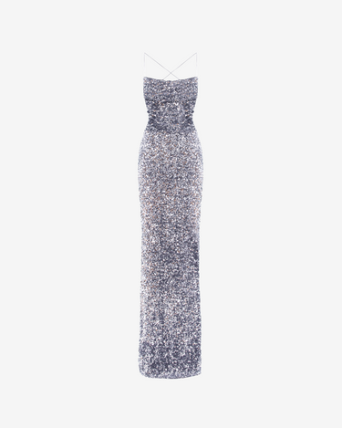 Rochia de seara din paiete, argintie, este o piesa spectaculoasa ce combina stralucirea glamour cu detalii elegante. Cu croiala lunga, spatele gol si crapatura laterala, evidentiaza silueta si adauga senzualitate. Papioanele din stofa in zona lombara si bretelele subtiri completeaza designul sofisticat.