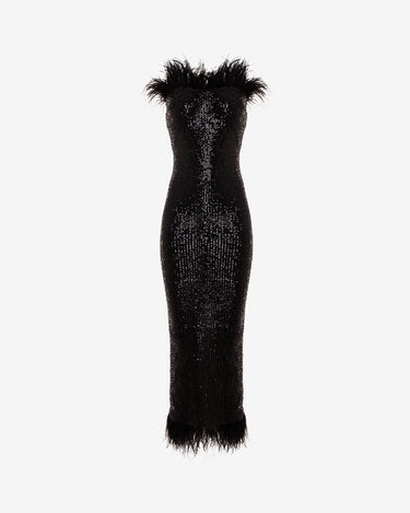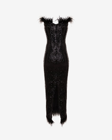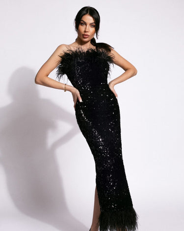 Rochia din paiete cu pene Anna, neagra, este o piesa vestimentara ce te va face sa stralucesti la orice eveniment special. Materialul din paiete ofera un aspect luxos, iar aplicatiile din pene adauga un plus de eleganta si originalitate. Aceasta rochie pretioasa se inchide cu fermoar ascuns la spate, asigurand o potrivire perfecta si un look impecabil.