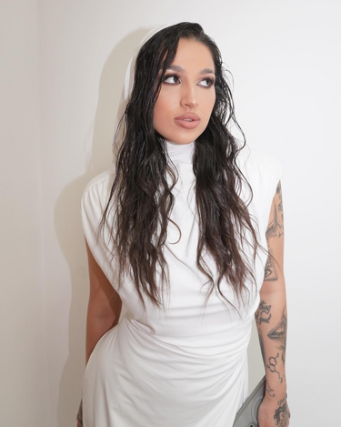 Silueta sculpturala realizata din lycra elastica, rochia Echo Drape imbina fluiditatea cu intentia clara. Proiectata sa urmeze linia corpului ca o a doua piele, tesatura se muleaza si se misca odata cu tine, accentuand formele naturale fara a restrictiona. Gulerul inalt drapat evoca pliuri digitale, adaugand profunzime si dimensiune, in timp ce manecile scurte adauga o structura moderna si puternica. Din fata, exprima retinere si precizie — dar spatele spune o alta poveste: adanc decupata, dezvaluie un contrast puternic intre acoperire si expunere. Curata si minimalista la prima vedere, dar bogata in constructie la o privire mai atenta, aceasta piesa intruchipeaza o complexitate tacuta — acolo unde eleganta atemporala se intalneste cu distorsiunea contemporana.