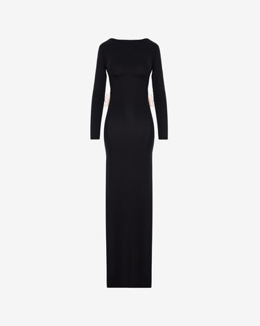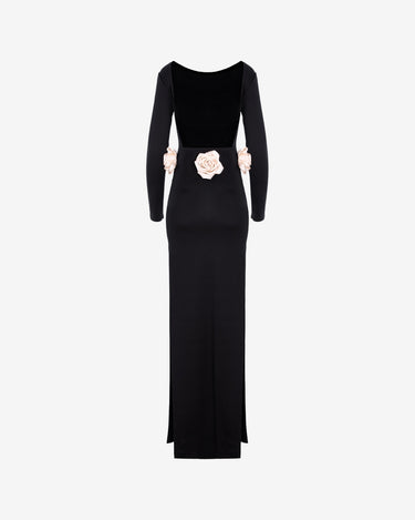 Rochia lunga three roses, neagra, este o alegere spectaculoasa pentru evenimente speciale, emanand eleganta si feminitate. Designul sau unic include un spate gol si o crapatura pe o parte, subliniata de trei trandafiri delicati, care adauga un aer romantic si sofisticat. Materialul din lycra asigura confort si o potrivire perfecta, accentuand silueta.