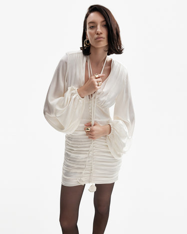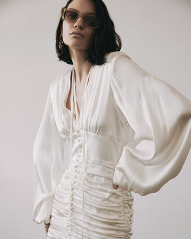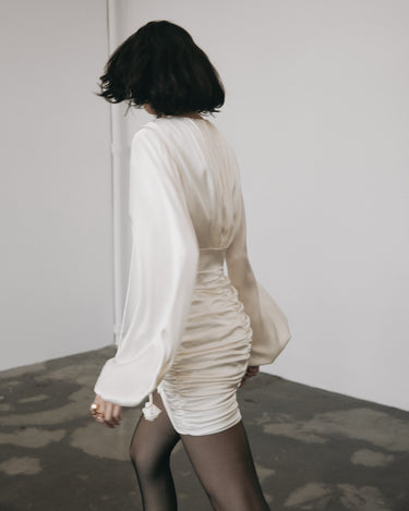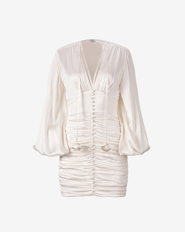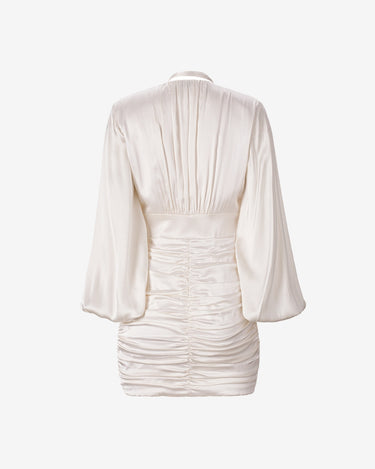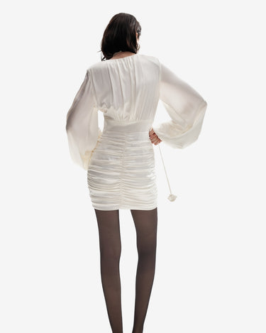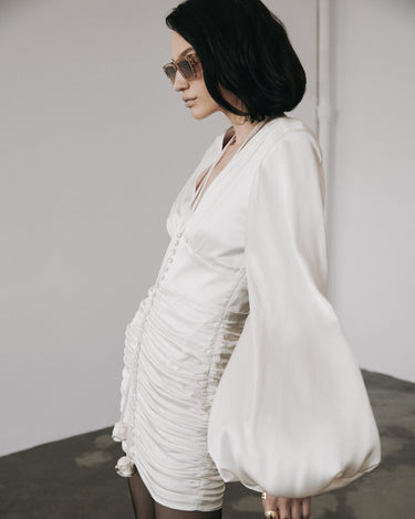 Rochia Mini cu Fronseuri, Alba, confectionata din matase lucioasa, emana eleganta clasica. Fronsele de pe solduri flateaza silueta, iar manecile ample si talia definita completeaza designul. Nasturii din matase si breteaua cu rozete de stras adauga un rafinament atemporal, facand-o perfecta pentru orice ocazie.