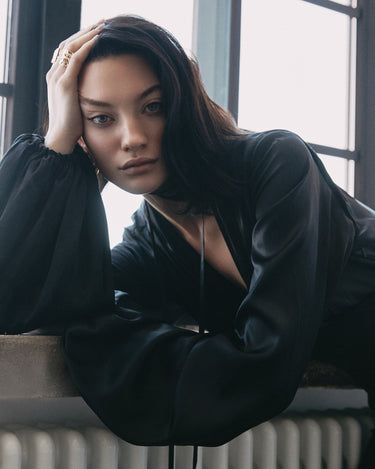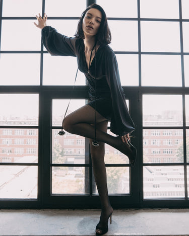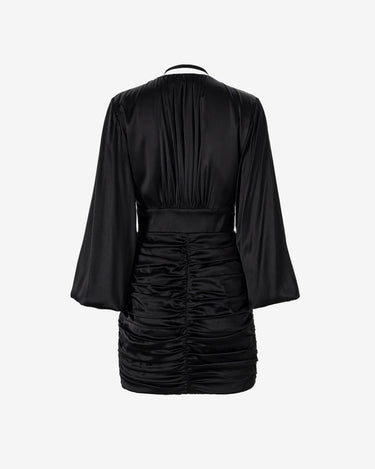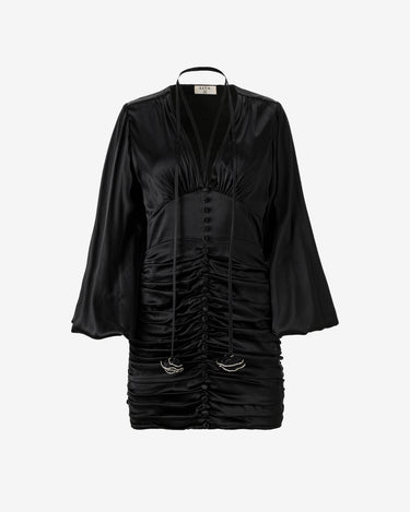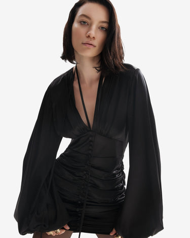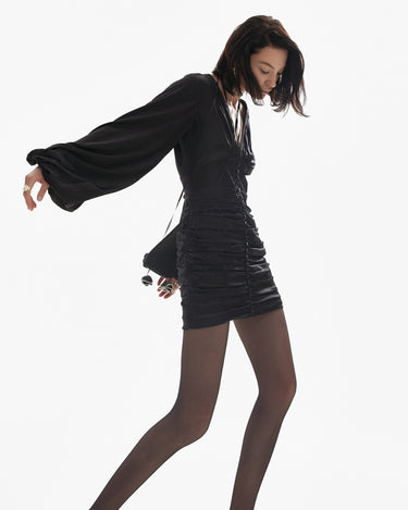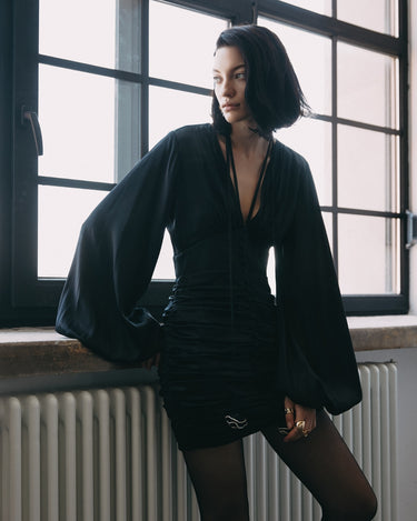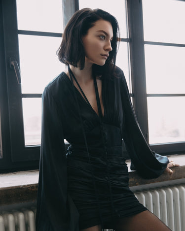 Rochia Mini cu Fronseuri, Neagra, emana eleganta clasica prin matasea neagra lucioasa. Fronsele delicate de la solduri flateaza silueta, iar manecile ample si talia definita completeaza designul. Nasturii din matase si breteaua cu strasuri adauga un rafinament atemporal.