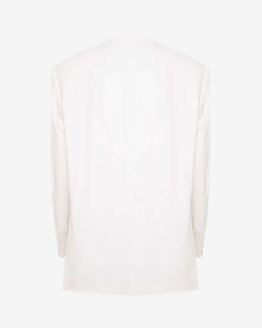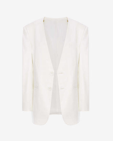 Sacoul supradimensionat fara revere, alb, este o piesa moderna si rafinata, ideala pentru un look minimalist si contemporan. Cu o croiala lejera si inchidere frontala cu doi nasturi mari, ofera versatilitate si eleganta, fiind complet captusit pentru un plus de confort si finisaj premium.