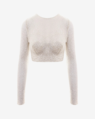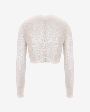 Topul crop din paiete, ivory, este o piesa stralucitoare si eleganta, ideala pentru tinute de seara cu impact. Confectionat din paiete italiene si cu o croiala scurta, adauga un aer glam oricarei aparitii. Poate fi purtat cu jeans pentru un look casual-chic sau cu fusta din paiete pentru un efect maxim.