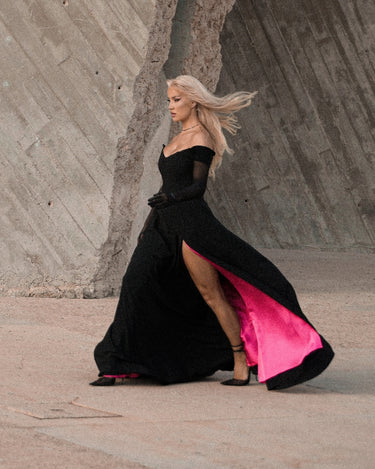 Rochia de gala cu manusi timeless sparkle, neagra, este o piesa vestimentara ce imbina eleganta clasica cu detalii moderne si stralucitoare. Aceasta rochie de seara lunga se remarca prin umerii goi, designul tip corset cu balene si fusta tip A crapata pe picior, oferind o silueta feminina si sofisticata. Manusile accesorizate cu cristale RF adauga un plus de glamour si exclusivitate. Decolteul in V si captuseala roz contrastanta completeaza aspectul rafinat.