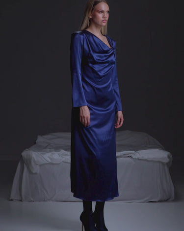 Rochia Lunga Albastra de Matase este o piesa statement creata pentru a atrage toate privirile. Confectionata din satin de matase fluid si luminos, rochia prezinta un decolteu drapat delicat, ce pune in valoare zona bustului cu o eleganta fireasca. Manecile lungi, usor evazate, echilibreaza silueta, iar croiala pe bie urmareste linia corpului, alungind vizual si oferind o miscare subtila la fiecare pas.