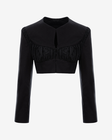 Croit cu umerii accentuati si un corp scurt, sacoul reprezinta un sistem defect intentionat. Bustul incretit evoca forma cupelor de sutien inserate, in timp ce tivurile intentionat nefinisate si asimetria intrerup croiala traditionala. Sacoul are un sistem de inchidere prin mos si baba pe mijloc fata.