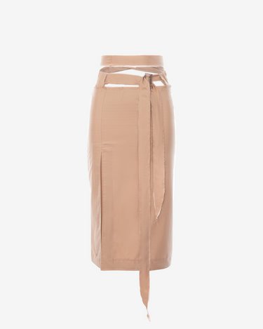 Fusta are o silueta de tip creion deconstruita, care tulbura asteptarile cu o precizie atenta. Decupajele cu margini brute din talie dezvaluie spatii negative, creand iluzia unei centuri fragmentate ce pluteste deasupra soldurilor. Legaturile asimetrice coboara ca un cod intrerupt, in timp ce o fanta subtila ofera miscare in cadrul structurii. Confectionata dintr-un material fluid, dar structurat, intr-o nuanta neutra, nude, aceasta piesa este atat tehnica, cat si senzuala—ca un sistem redus la cea mai vulnerabila sintaxa. Un omagiu adus arhitecturii expuse si fortei a ceea ce este omis.