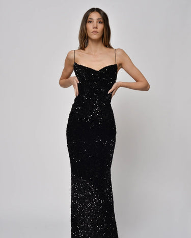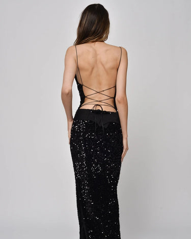 Rochia lunga cu paiete, neagra, este o piesa vestimentara ce emana eleganta si rafinament. Designul cu spatele gol, crapatura laterala si aplicatiile in forma de papion ofera un aer sofisticat. Captuseala interioara asigura confort, iar inchiderea cu fermoar lateral faciliteaza imbracarea.