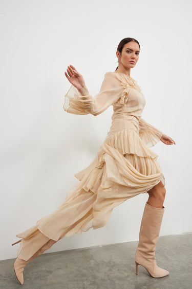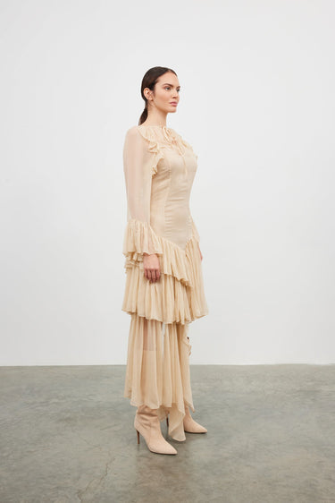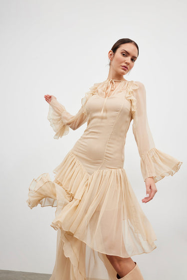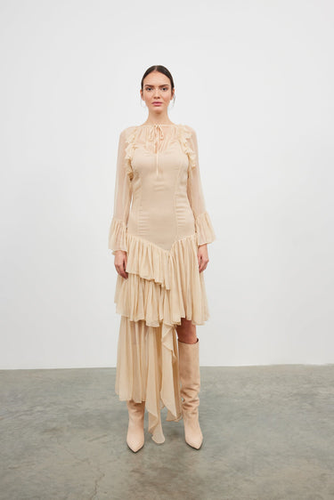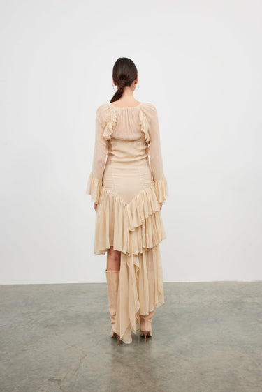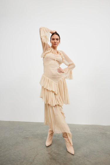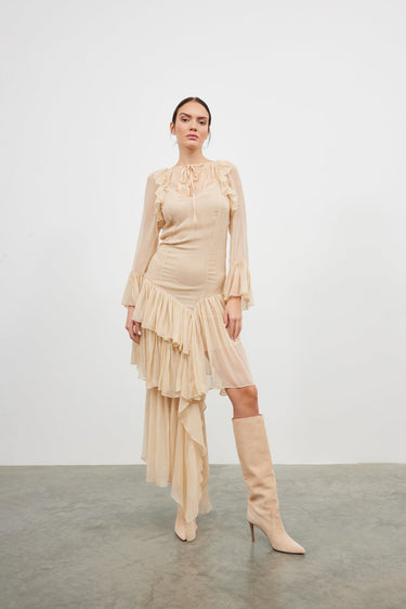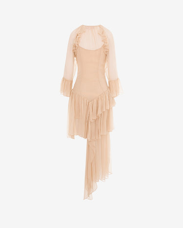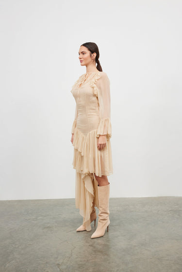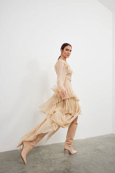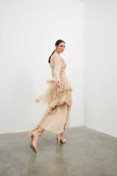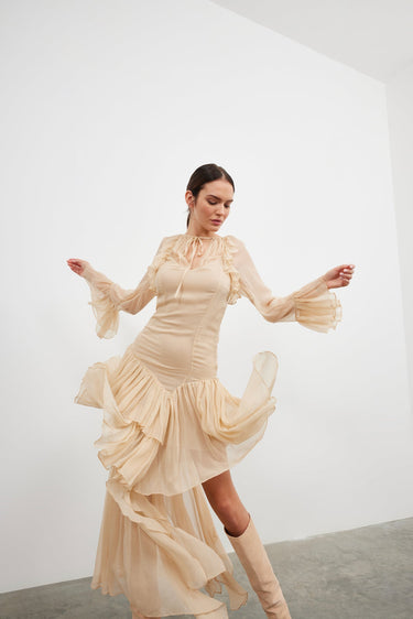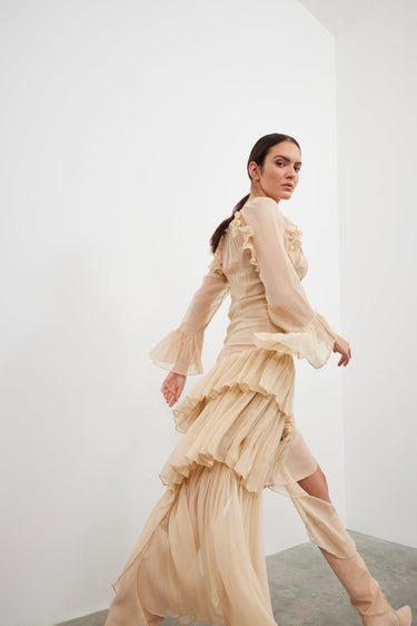 Cu rochia L'Odyssee, tinutele pentru evenimente sunt deja rezolvate. Realizata din matase luxurianta, are o captuseala interioara pentru confort si acoperire suplimentara. Aceasta rochie diafana cade frumos pe corp si este decorata cu volanase care se misca delicat la fiecare pas. Poate fi purtata cu sandale cu toc pentru seri exclusiviste sau cu cizme inalte pentru evenimente pline de energie.