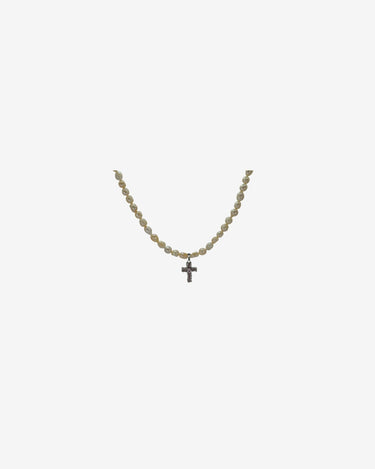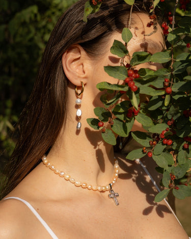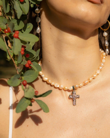 • Necklace with pink cultured pearls and stainless steel cross.