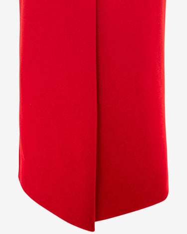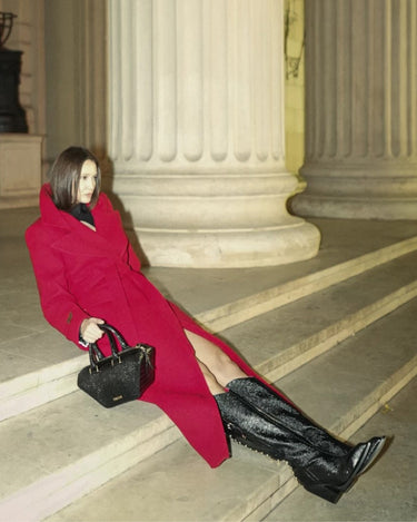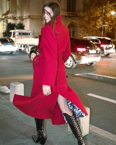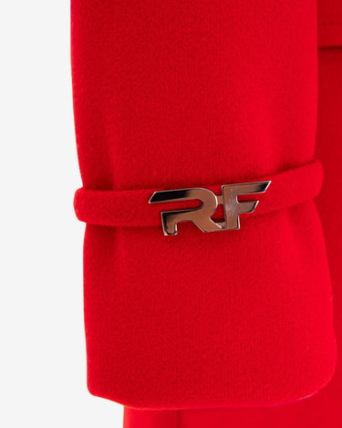 The long coat with drawstring and metallic details, red, is a classic and timeless piece of clothing, inspired by a red family coat. This warm coat stands out with its masculine structure, removable drawstring at the waist and metallic RF detail on the sleeve. Flap pockets and a back slit add functionality and a touch of style. Comfortable and easy to wear, this red coat is ideal for cold days.