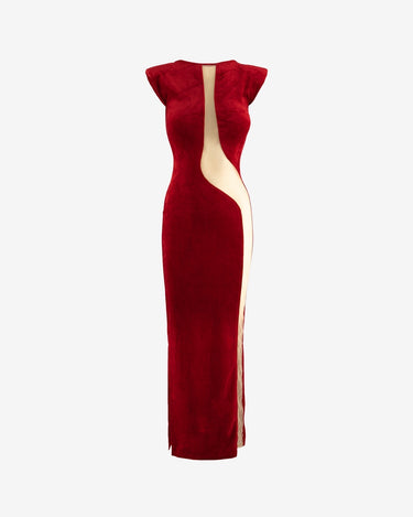 The velvet blankie dress with tulle detail, red, is an evening piece that combines classic elegance with modern details. Made of soft velvet, this dress offers great comfort and a luxurious look. The nude tulle neckline, which extends to the foot, adds a sensual and sophisticated element. The padded shoulders accentuate the silhouette, and the soft touch material ensures a pleasant feeling to the touch.