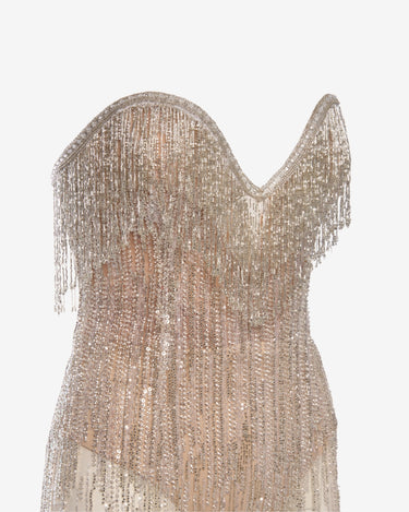• Design: mesh corset with beads and fringes, central slit, V-neckline