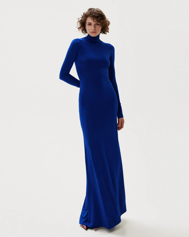 The blue high-neck knit maxi dress combines minimalist elegance with the comfort of a form-fitting, flowing cut. Made from soft, stretchy knit, it follows the body's contours, while the high collar and long sleeves add a sophisticated touch. A discreet back zipper closure completes the refined design.
