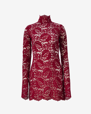 The high-neck mini dress with embroidered lace, blood is a romantic and sophisticated piece, made of semi-transparent embroidered floral lace. The mini cut, high collar and long sleeves give it an elegant air, and the scalloped edges add a delicate and refined detail.