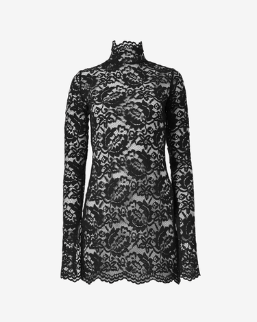 The black high-neck embroidered lace mini dress is an elegant and refined piece, perfect for sophisticated appearances. Made of semi-sheer embroidered floral lace, with long sleeves and scalloped edges, it adds a romantic and timeless air to every outfit.
