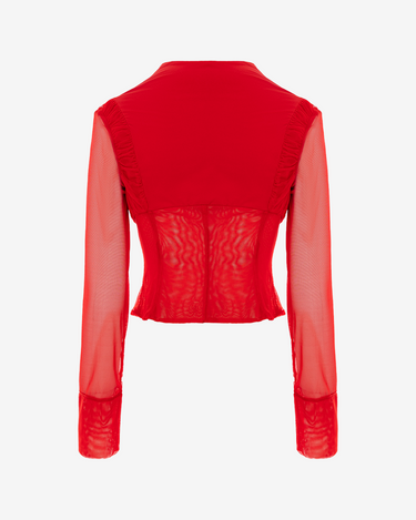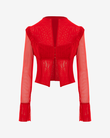 The sheer, stretchy tulle shirt, with a corset-inspired base, explores the idea of ​​an “interface” between digital sheen and internal code. Draped details at the bust recall the structured cups of a bra, while translucent, cuffed sleeves reinterpret the classic shirt in a disruptive way. The middle-front snap closure creates a clean, yet unfinished line. Precision and exposure coexist in a single sculptural layer.