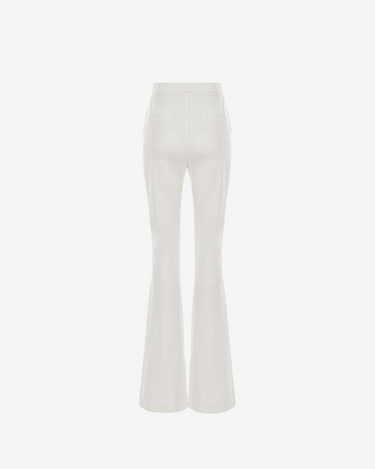 • High-waisted pants without pockets, featuring oversized, asymmetrical bows.