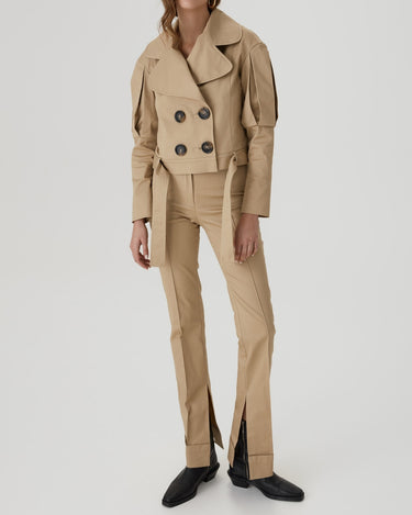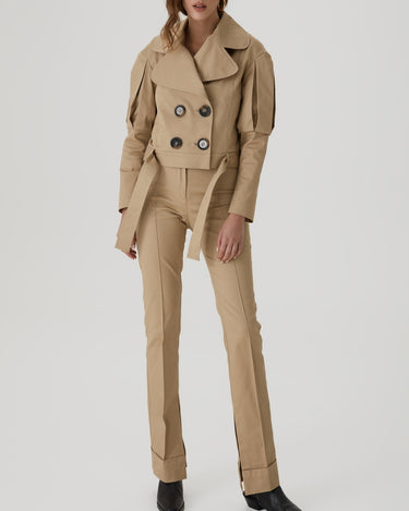 The high-waisted beige trousers offer fluid movement thanks to their flared legs and full length. Finished with a front pleat and side slits, they create an elongating effect. For a refined silhouette, pair them with a statement jacket with wide lapels.